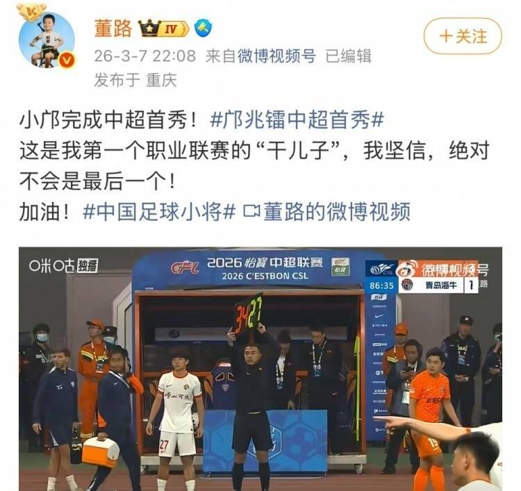 喜讯!16岁邝兆镭完成中超首秀,名嘴董路骄傲宣布:他是我干儿子
