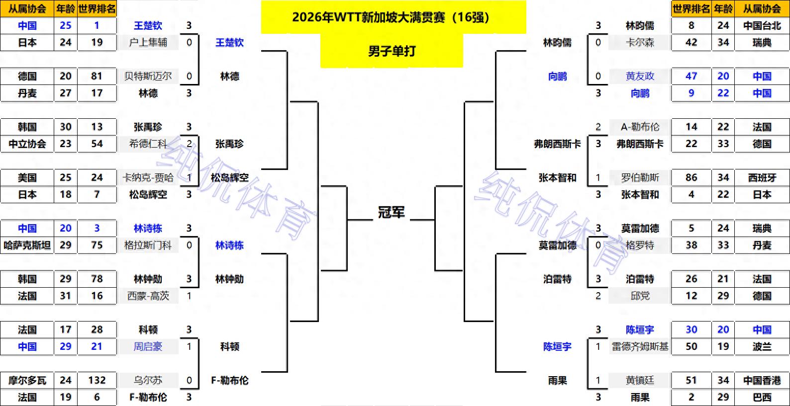 北京时间2月25日晚,2026年WTT新加坡大满贯赛结束了正赛第4天的争夺,目前单打16强正式出炉!韩国单打一…