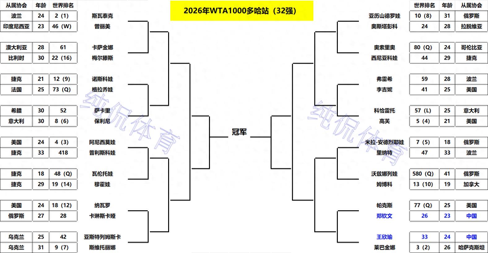 多哈1000赛32强出炉!郑钦文再战美国强敌;王欣瑜大战莱巴金娜
