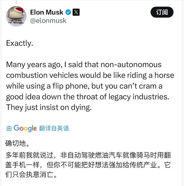 马斯克最新断言:非自动驾驶燃油车终将消亡