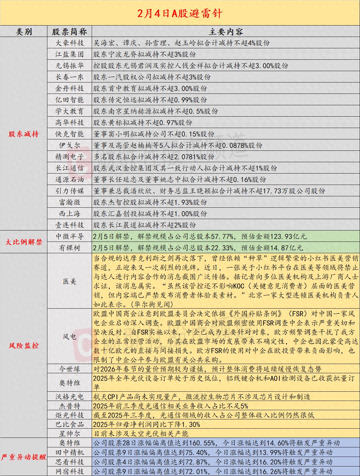 导读:财联社2月4日投资避雷针,近日,A股及海外市场潜在风险事件如下。