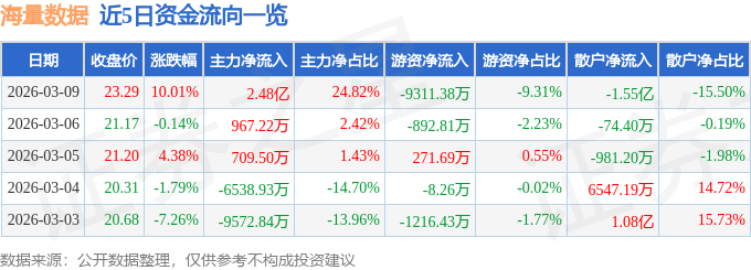 证券之星消息,海量数据3月9日涨停收盘,收盘价23.29元。该股于9点41分涨停,1次打开涨停,截止收盘封单资…