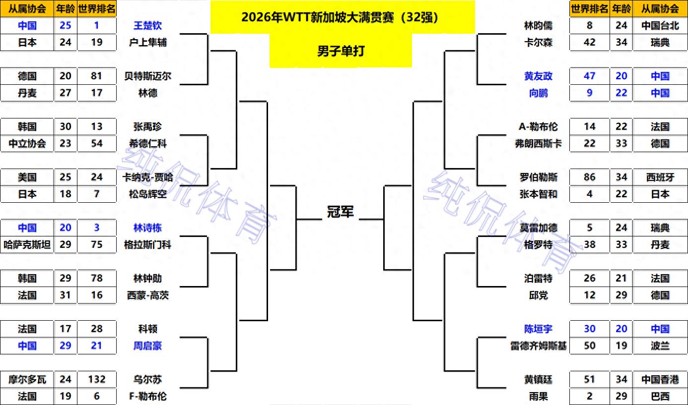 北京时间2月23日晚,2026年WTT新加坡大满贯赛结束了正赛第2天的争夺,目前单打32强正式出炉!本人详细整…