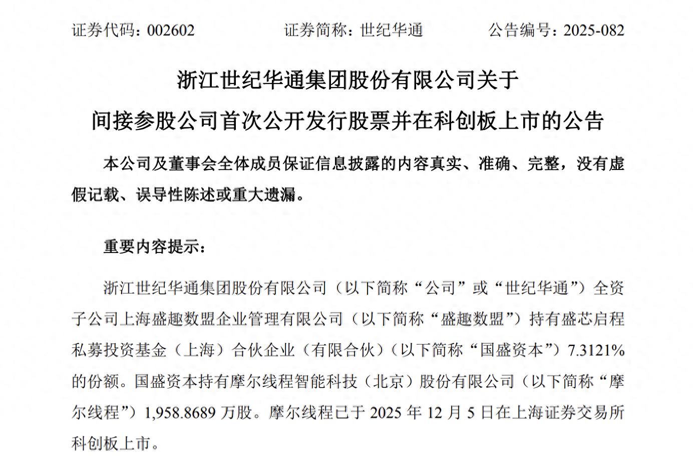 12月10日,A股市值第一的游戏厂商世纪华通(002602.SZ)发布公告,因间接投资摩尔线程,预计给今年第四…