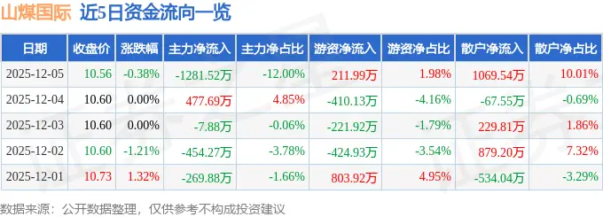 股票行情快报:山煤国际(600546)12月5日主力资金净卖出1281.52万元
