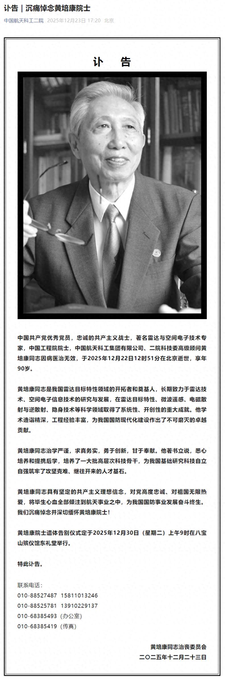 IT之家 12 月 23 日消息,据中国航天科工二院今日消息,黄培康同志治丧委员会发布讣告,著名雷达与空间电子…